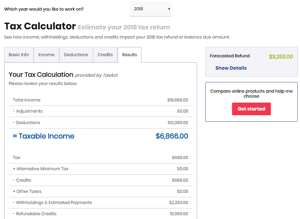 - Another option for estimating the current year return would be to utilize the Tax Calculator on the TaxAct website. From the TaxAct website, click Tax Info in the top center of the screen. On the website Tax Information for When You Need It Most, click the link Tax Tools & Calculators. From there click the link Tax Calculator and proceed through the screens to enter the information. On the final screen, titled Your 2018 Tax Calculation, you will be able to view a summary of the results based on your entries. From there you can also click the green link titled Start your return for Free! to start a return using the TaxAct program.